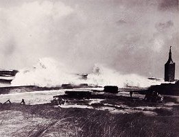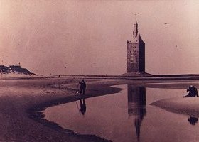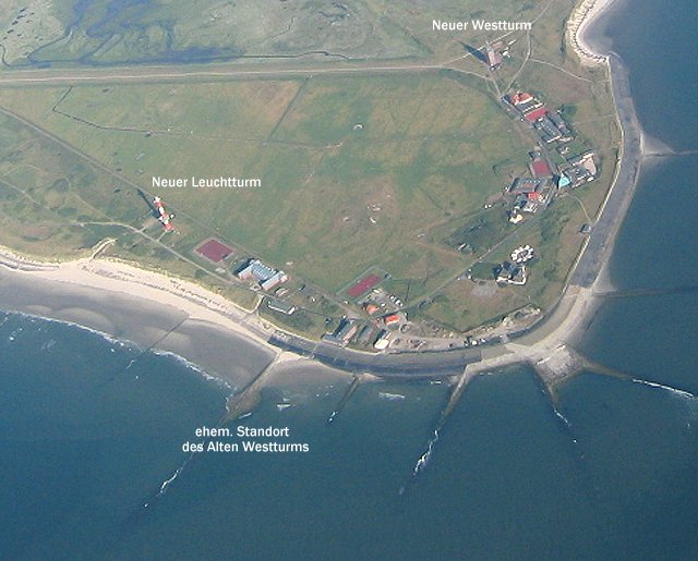 Rechts sehen Sie eine Projektion des Alten Westturms von ca. 1910 auf ein aktuelles Foto vom 24. Januar 2005. So erhält man eine gewisse Vorstellung davon, wie es wohl vor mehr als 100 Jahren hier ausgesehen haben mag. Durch den einsamen Standort am Inselstrande wirkt der Turm noch einmal so imposant.