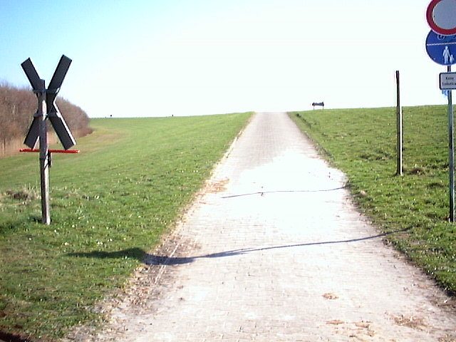 Sie stehen jetzt auf den Gleisen, wo der Zug durch den Deich hindurchfährt.