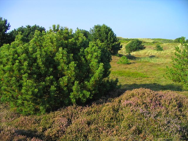 wie z.B. Heidekraut oder Kiefern. Sie sehen hier eine inseltypische Dünenlandschaft.