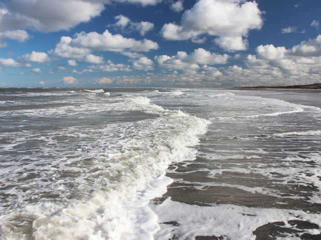 Nordseebrandung unter einem strahlend blauen Himmel mit weißen Wolken.